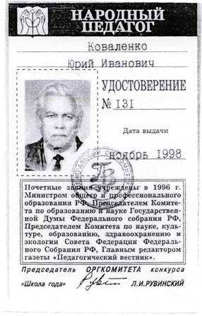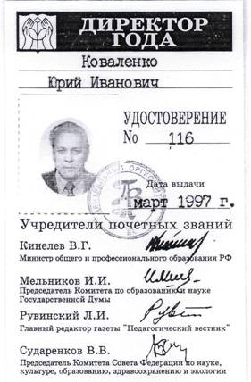 За заслуги в педагогической и воспитательной работе имя Коваленко Юрия Ивановича было внесено в 1997 году в справочник «Кто есть кто в Волгоградской области».