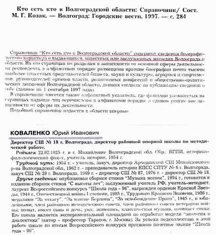 Страница 1 / Страница 2 / Страница 3 /Только в 1962 году Юрий Иванович добился увольнения, и семья Коваленко переехала в Волгоград. В областном центре он работал в школах Тракторозаводского района завучем, директором. Последние почти двадцать пять лет, до выхода на пенсию Ю.И. Коваленко руководил средней школой № 18.
